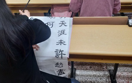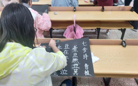 主持人介绍比赛流程和创作格式后,比赛正式开始。同学们开始奋笔疾书,以最佳的状态迎接此次比赛。“三笔字”分为钢笔组、粉笔组,三组分别在三个教室有条不紊的举行比赛。选手们实力强劲从创作过程中就已透露出十足的信心,写钢笔字的同学下笔刚劲有力,笔画清楚、到位、字距匀称,整体布局合理,笔画流畅分布均匀;粉笔字书写规范、整洁,整体版面设计美观,实用性与艺术性完美结合;毛笔字握笔正确,起笔行笔收笔如行云流水,笔锋清晰到位,字体大小适中。此次比赛最终在同学们的共同努力下圆满完成。