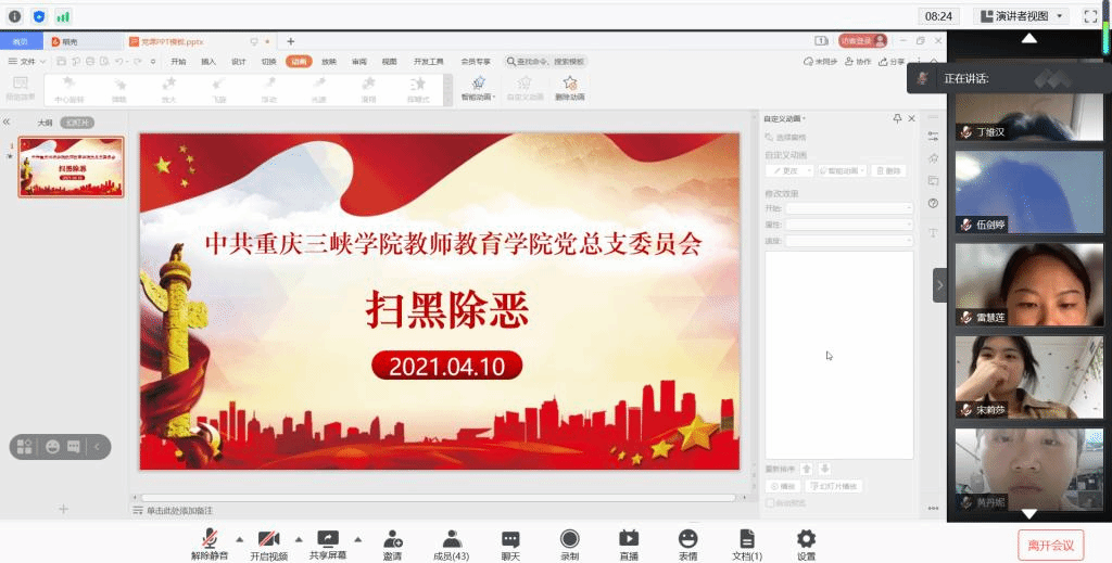 为深入学习贯彻党的十九届五中全会、中央全面依法治国工作会议中对于扫黑除恶专项斗争工作开展的决心,在全国扫黑除恶专项斗争即将收官,常态化扫黑除恶即将展开之际,教师教育公司党总支委员会于2021年4月10日晚7点在线上召开以"扫黑除恶"为主题的教育活动,党支部委员会第九期拟发展对象准时参加会议进行学习。