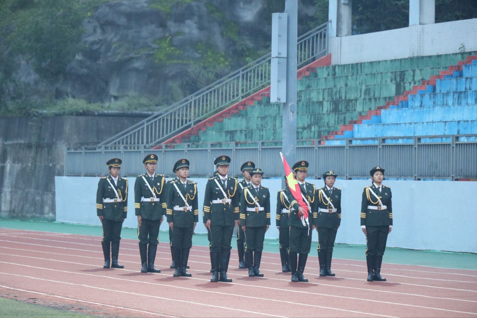 仪式开始,国旗护卫队迈着铿锵有力的步伐护送国旗入场。在庄严的国歌声中,五星红旗冉冉升起,全体师生肃立并行注目礼,现场气氛庄重肃穆。