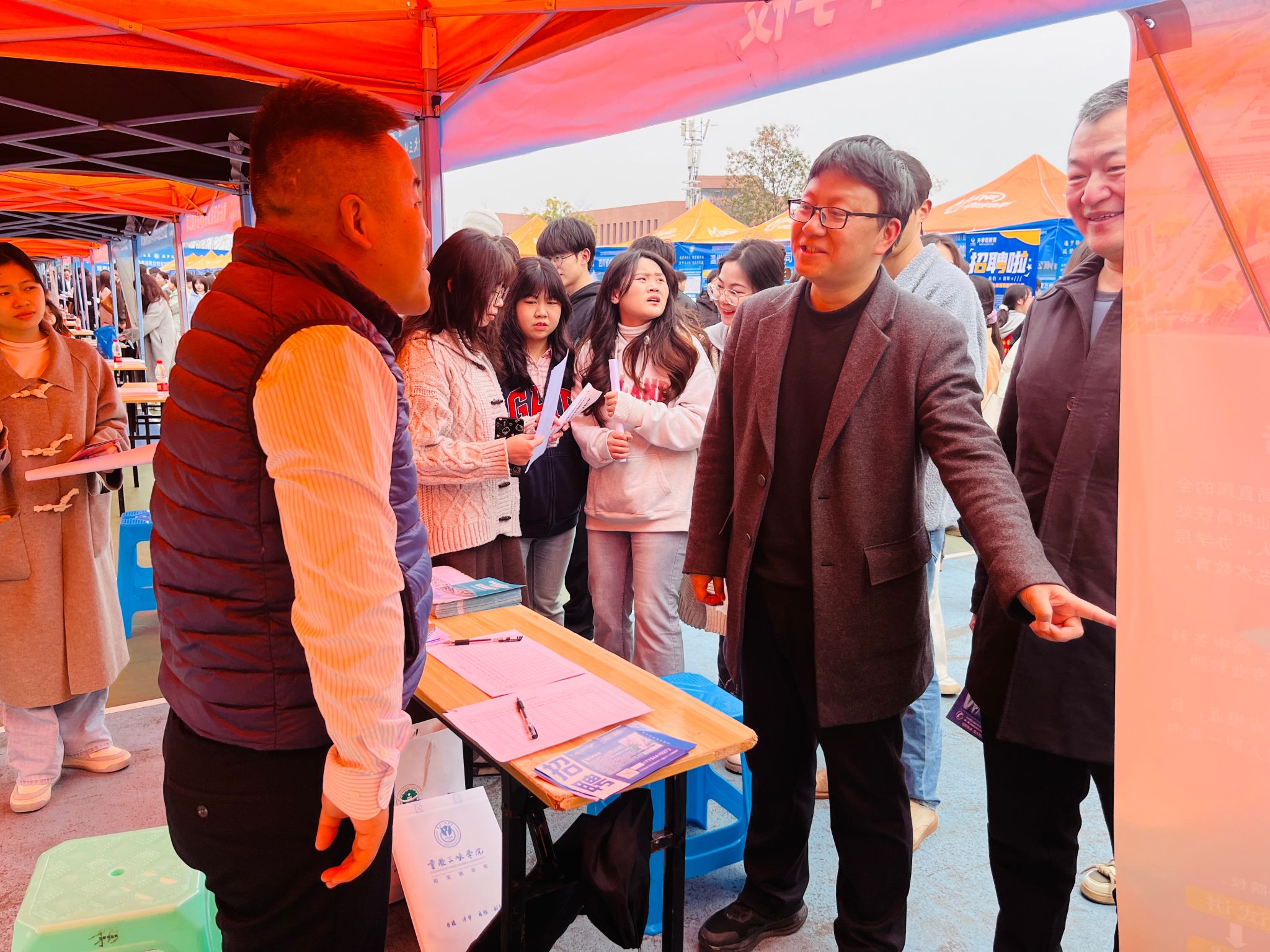 在湖北省仙桃荣怀公司展位前,许刚副经理与招聘负责人李世刚深入交流,详细了解该校校史沿革、办学特色及岗位发展规划,重点探讨师范生培养与基础教育需求的衔接路径。许刚副经理鼓励现场参加招聘的2021级生物科学(师范)专业员工要勇于交流,展现自身优势,同时对简历投递、笔试、面试等事项进行了叮嘱和强调。据统计,有12名毕业生通过现场考核进入复试环节,最终8人进入签约环节。