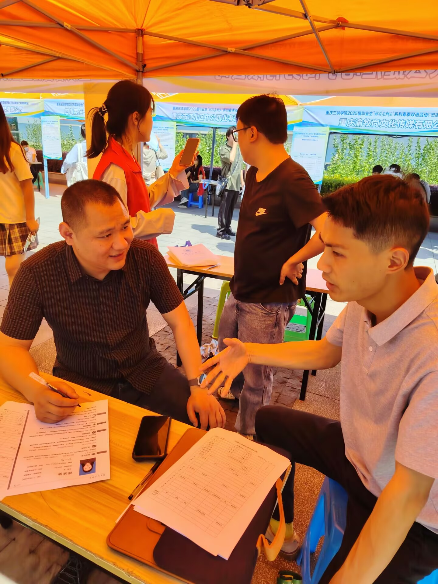 招聘会现场热闹非凡,几十家企业同聚在此,提供了许多就业岗位。周岭老师与员工们一同穿梭于各个展位,详细了解企业招聘需求。在追阳教学质量评估(重庆)有限公司展位前,周岭老师面对面与公司招聘负责人邹杰进行深入交流。他详细询问了公司的用人标准、岗位要求、薪资待遇等情况,并就当前教育科技行业的人才需求趋势交换了意见。追阳教学质量评估(重庆)有限公司招聘负责人介绍,公司十分重视人才全面发展,希望通过此次招聘会吸纳更多优秀毕业生,为重庆地区教育事业发展注入新活力,随后该公司负责人也一一解答了同学们提出的各个问题。周岭老师随即邀请追阳教学质量评估(重庆)有限公司来公司招聘。