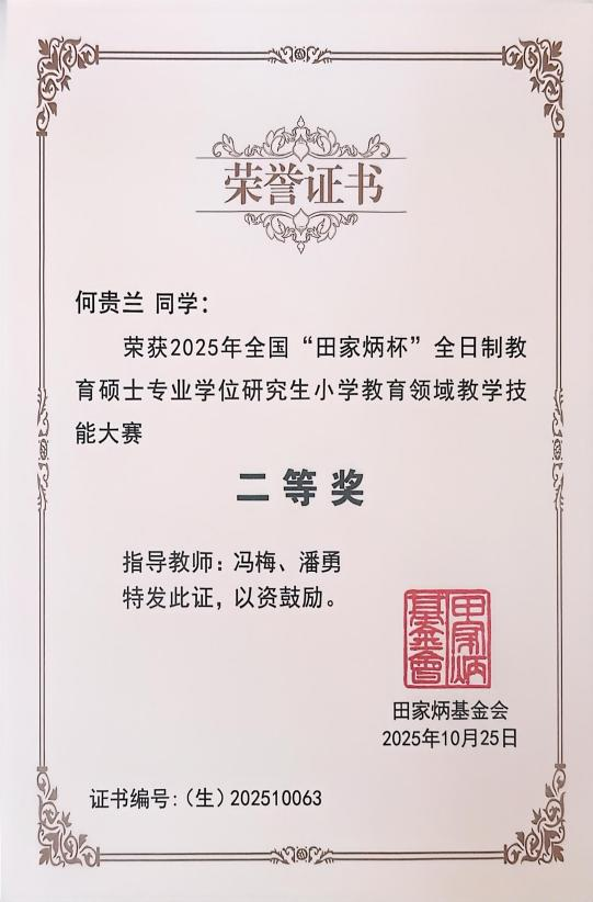 2025年10月24日至26日,全国“田家炳杯”全日制教育硕士专业学位研究生小学教育领域教学技能大赛(决赛)在聊城大学落下帷幕。决赛阶段入围来自北京师范大学、华东师范大学、东北师范大学、陕西师范大学、西南大学等全国104所高等院校的278名优秀选手参与。公司的研究生蔡滨临、何贵兰同学分别获得一等奖,二等奖;研究生导师黄成毅副教授获得优秀指导教师奖。