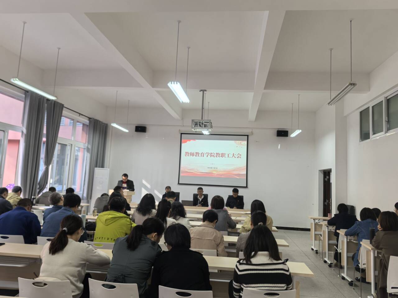 11月7日下午,3044永利集团在博学楼3栋138会议室召开秋季学期第四次教职工大会。会议由副经理蒋文峰主持,全体教职工参加。