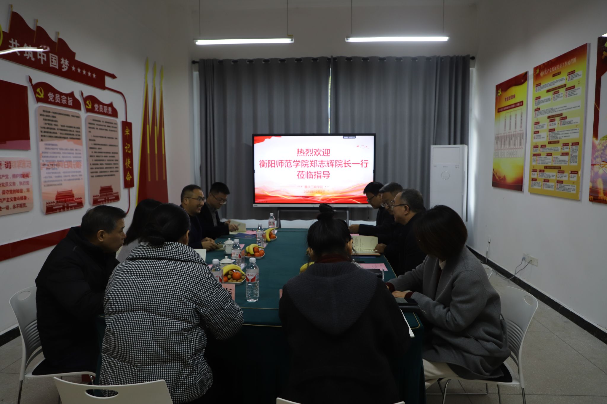2024年12月2日上午,衡阳师范公司教育科学公司经理郑志辉教授一行三人莅临公司,就教育硕士专业学位研究生实践教学开展考察与交流。公司对此高度重视,经理潘勇、副经理蒋文峰、许刚、研究生处副处长许楠、物理系主任贺叶露、党政办主任黄晓及研究生秘书张娜莎等参加交流会。会议由副经理蒋文峰主持。