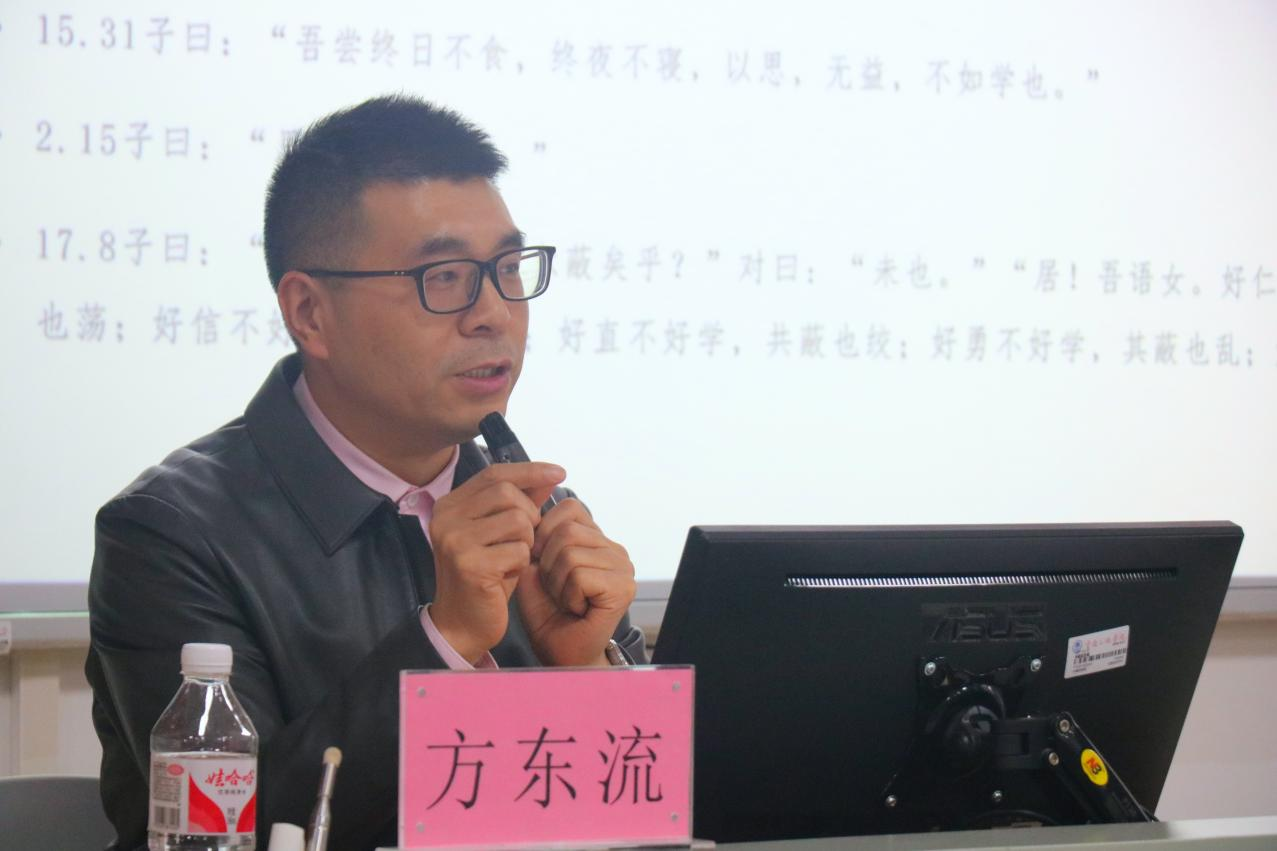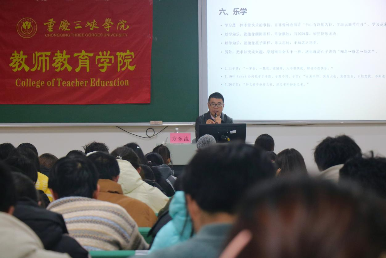 2024年12月26日下午2点,3044永利集团于博学楼1栋201成功举办了一场以“读《论语》,悟学习之道”为主题的学术讲座。本次讲座由重庆树人教育研究院中学研发主任、重庆国学学会常务理事、中国作家协会会员方东流老师主讲,3044永利集团副经理许刚主持,一百余名员工参与