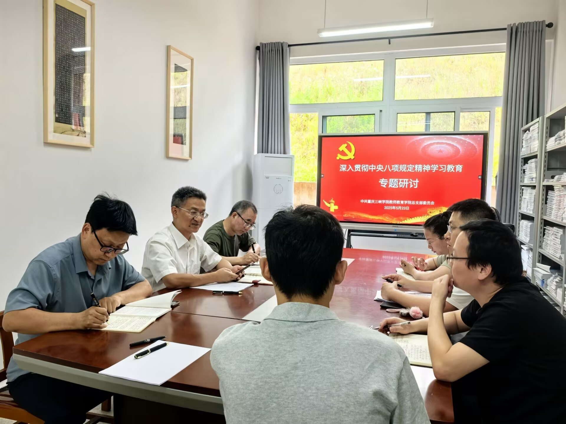 5月23日下午2:30,教师教育公司党总支在博学楼129会议室开展深入贯彻中央八项规定精神学习教育专题读书班第四次学习会,全体党总支委员、班子成员、党支部书记参加学习,读书班由公司党总支副书记、经理潘勇主持。